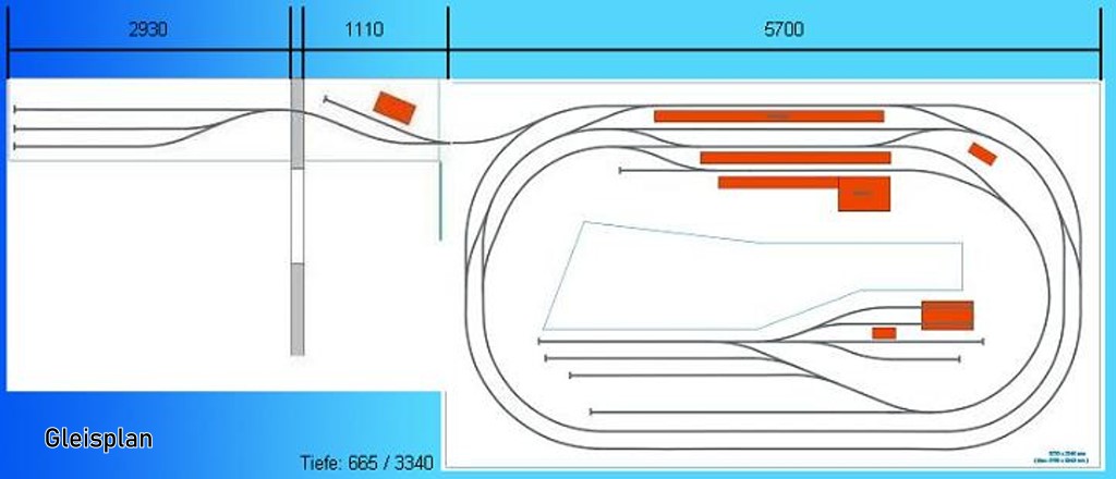 Um mehrere Züge automatisch fahren lassen zu können fiel die Wahl vom Prinzip her auf ein zweigleisiges Oval. Das sieht in der Zeichnung etwas sehr stark nach „Spielbahn“ aus und es gibt sicherlich vorbildgerechtere Gleisanlagen, aber wenn man sich auf das Geschehen im Bahnhof konzenztriert und die Strecke als notwendiges Übel ansieht, kann man mit der gefundenen Lösung doch zufrieden sein.